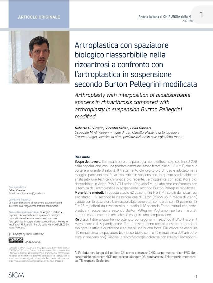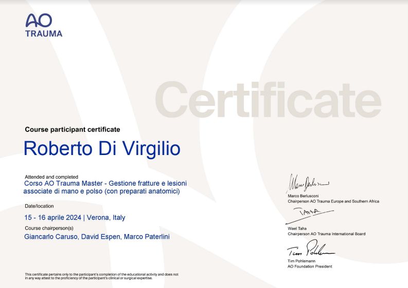 Ortopedico Traumatologo con incarico di alta specializzazione in Chirurgia della mano. Mi sono laureato in Medicina e Chirurgia con 110/110 e lode presso “Università La Sapienza Roma” e sempre presso la medesima Università ho conseguito la Specializzazione in “Ortopedia e Chirurgia” con 70/70 e lode. Dal 1/1/2008 ricopro l’incarico di Dirigente Medico di 1° Livello presso la divisione di “Ortopedia e Traumatologia” dell’ Osp. M.G. Vannini Roma dove eseguo numerosi interventi come primo operatore per artrosi, traumatismi ad alta energia, traumi sportivi e patologie ultraspecialistiche riguardanti la Chirurgia della Mano della quale ho ricevuto l'Incarico di Alta Specializzazione.